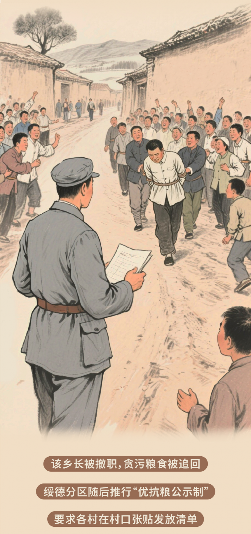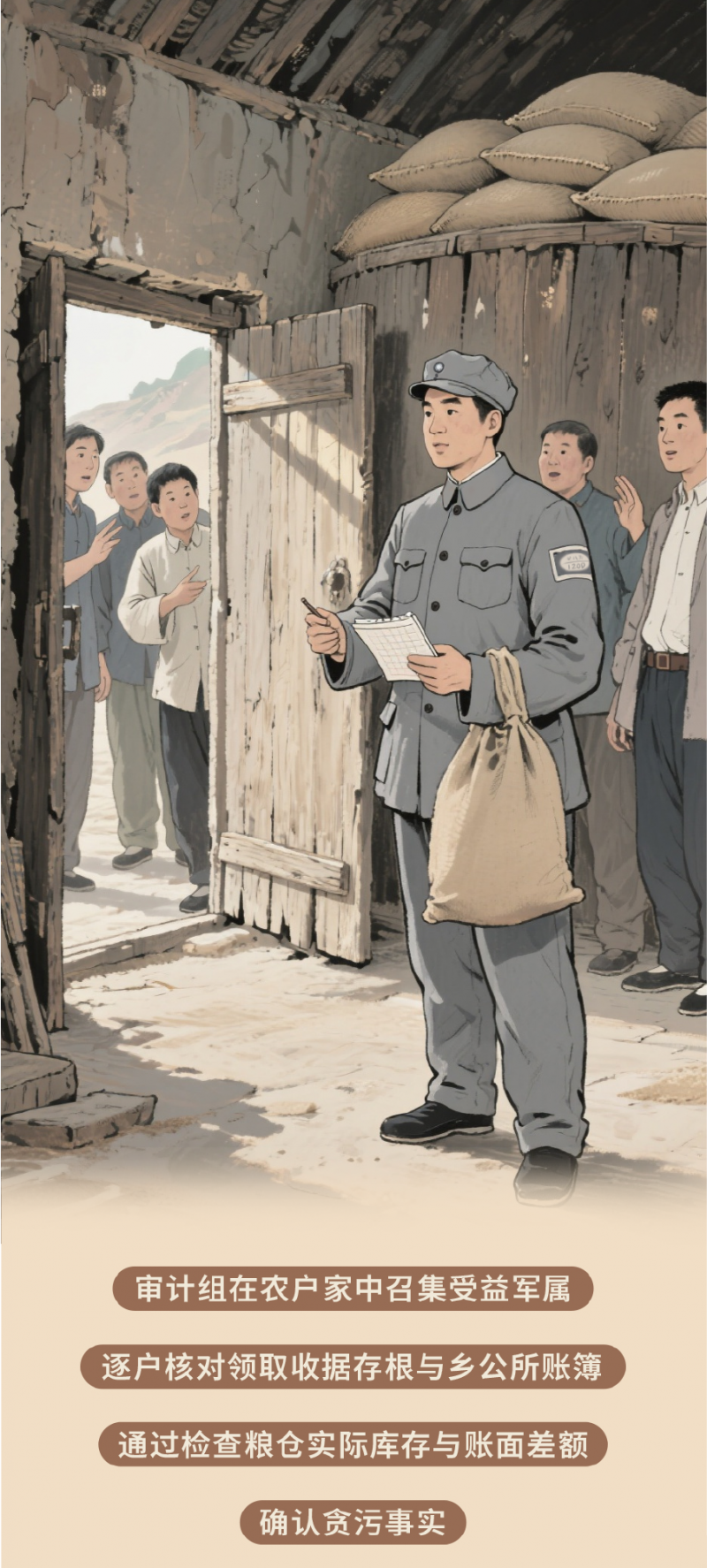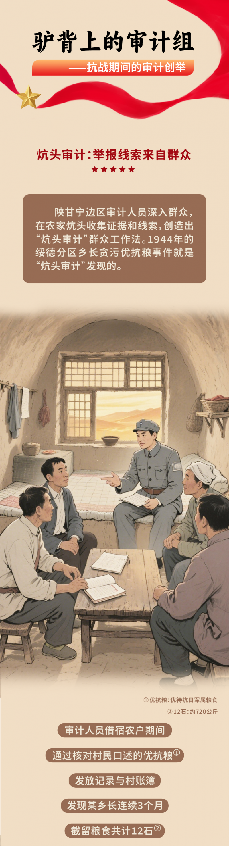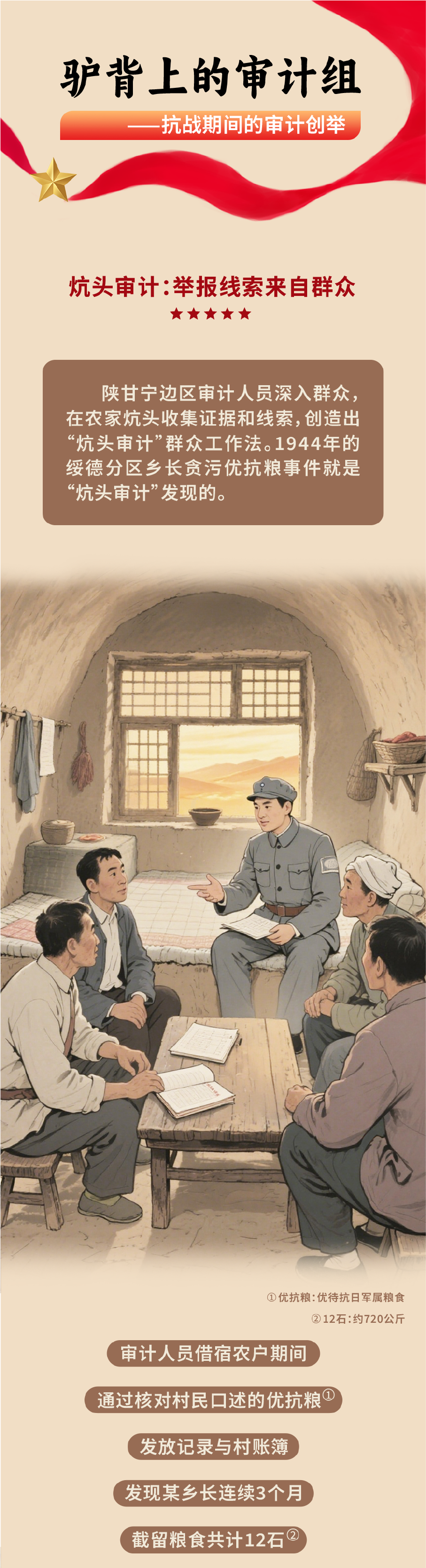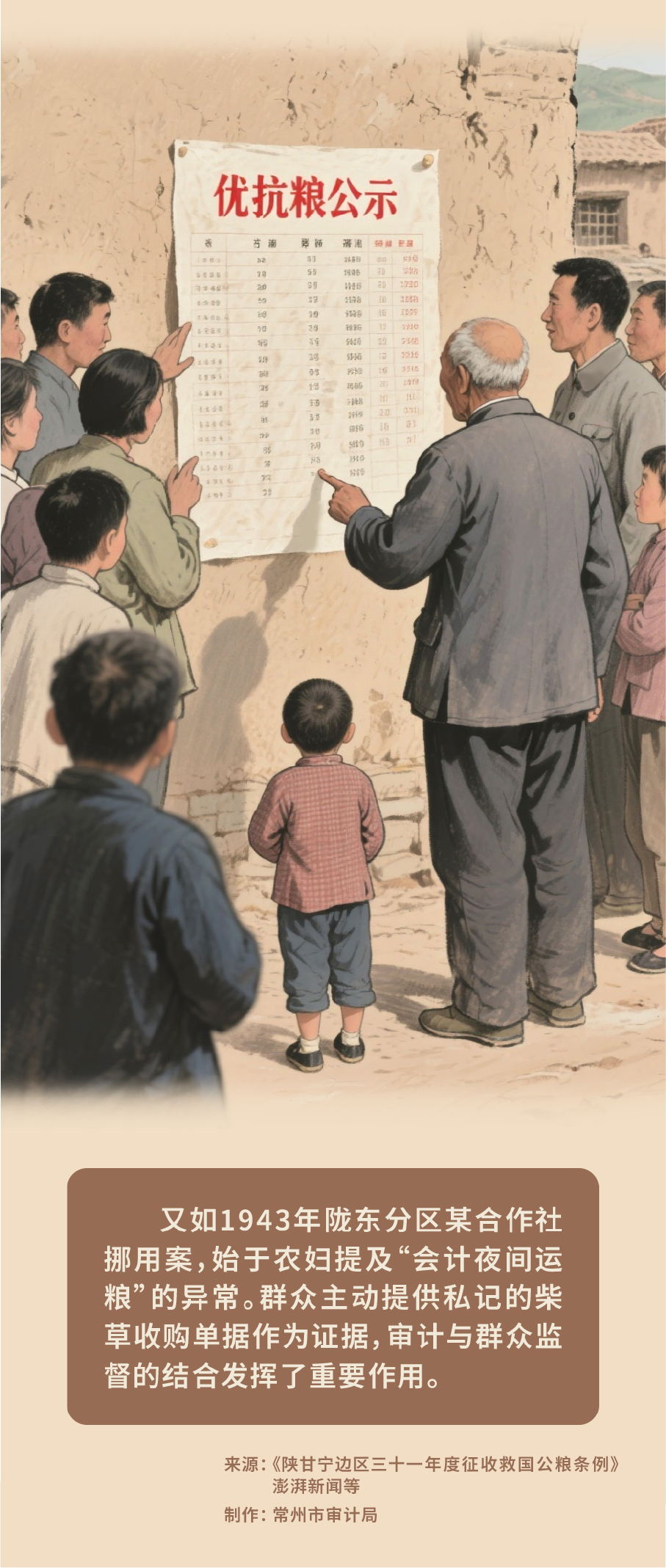 腰备枪支,肩挎特制折叠算盘,1943年,八路军陕甘宁边区陇东分区审计组单月行程逾600里,在驴背上完成一项项账目核验……抗日战争时期陕甘宁边区的审计工作被誉为“中国共产党早期治理能力的重要体现”。常州市审计局以漫画形式,再现了极端困难条件下的一项项审计创举,在感悟历史中坚守初心,从伟大胜利中汲取奋进力量。